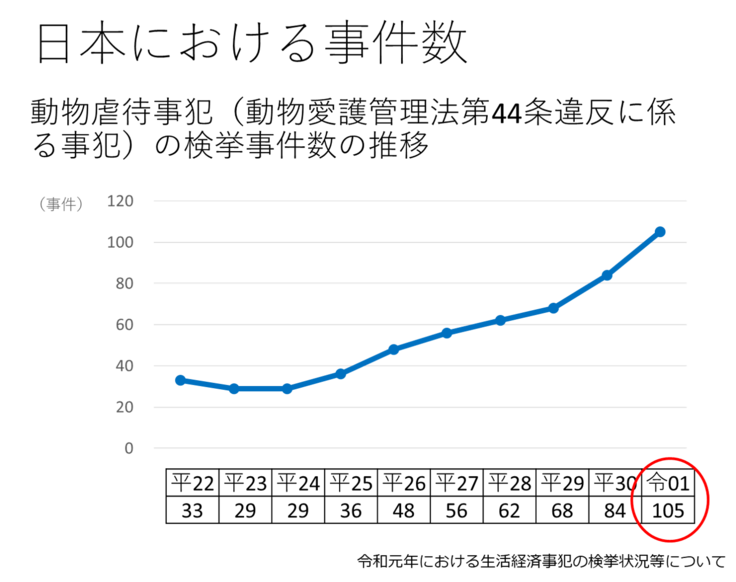 動物虐待事犯の検挙件数は、平成22年の33件から令和1年度では年間105件に増加し、悪化の一途をたどっています。※1日本獣医生命科学大学においては、虐待が疑われる動物の不審死体の解剖を年間200件以上実施していることから、実際の虐待事案はさらに多いと考えられます。