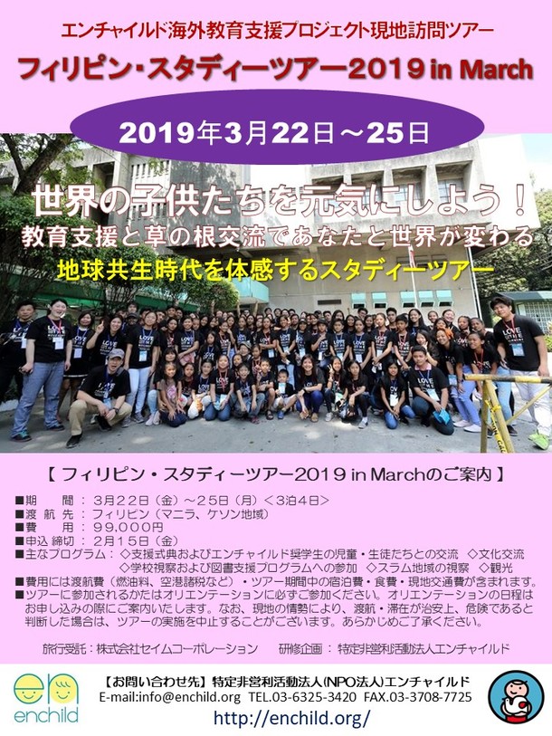 3月22日(金)~25日(月)の3泊4日のスケジュールでマニラ地域を主な訪問先とするスタディーツアーが開催されます。
