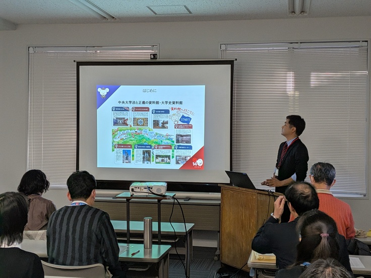 さて、11月21日(金)には「東京都三多摩公立博物館協議会・三多摩地域資料研究会」の50名以上の皆様に研修会場としてご利用いただき、「中央大学大学史資料館所蔵資料と多摩地域」と題して当館スタッフが講演を行いました。また、「大学史資料館」と「法と正義の資料館」の展示解説をお聞きいただきながら見学をしていただきました。