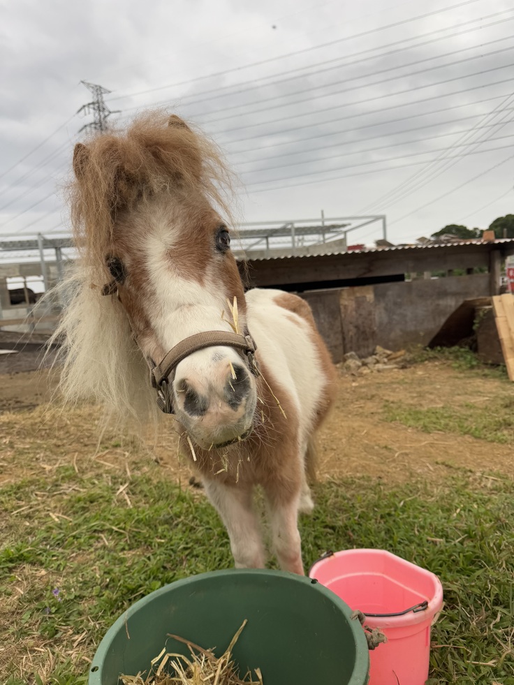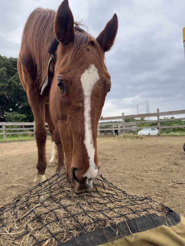 写真にある大きなヘイネットの中身はロール草です。皆様のマンスリーサポートで週一回購入し、毎日馬たちにお腹いっぱい与えることができています。皆様のお力添えに心から感謝いたします。