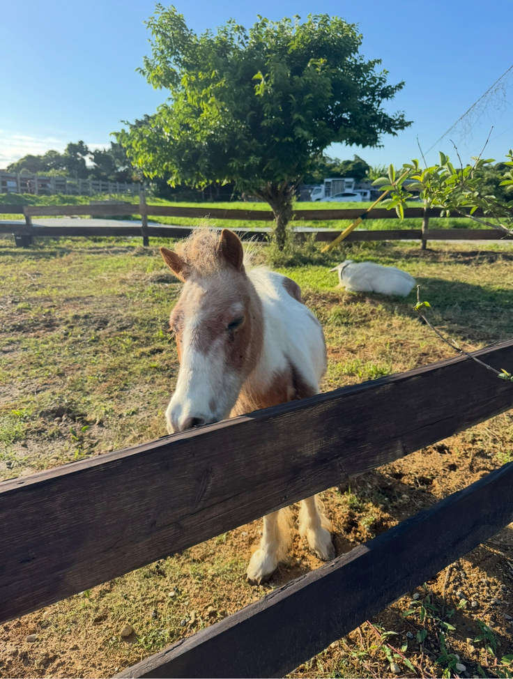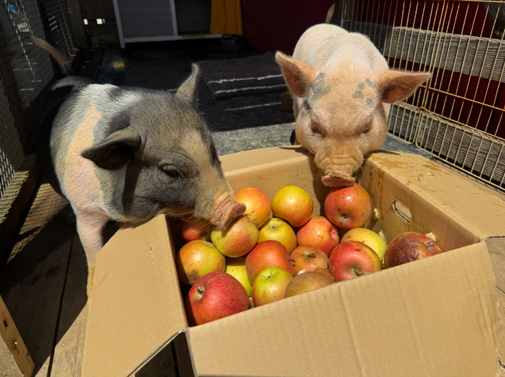 ミニブタのポンチョとポパイをはじめ、馬たちもみんな大喜び🍎あっという間に箱は空っぽになりました。