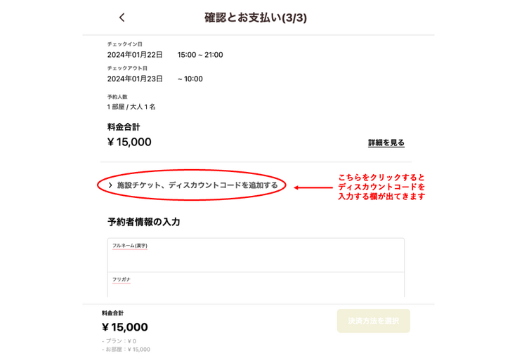 ご予約を進めていき、ご予約者の情報を入力する画面にてディスカウントコードの欄にクーポン番号を入力していただきます。