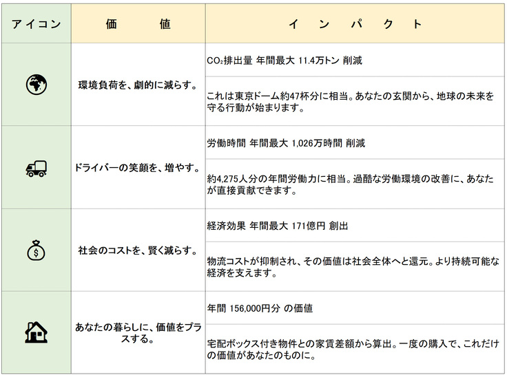 あなたの玄関に吊るされた一つの箱が、配達員の方の笑顔を増やし、地球の未来を少しだけ良くする。そんな未来を、あなたと一緒に作れたら、これほど嬉しいことはありません。