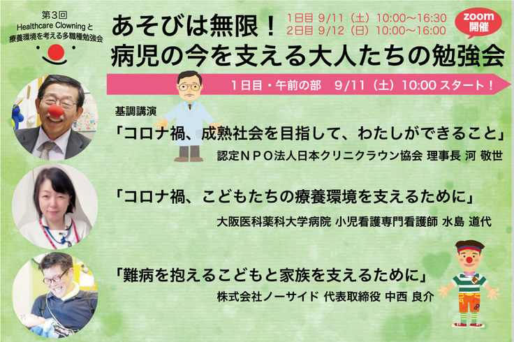 日本クリニクラウン協会は、9月11日(土)12日(日)に「あそびは無限!病児の今を支える大人たちの勉強会」を開催します。