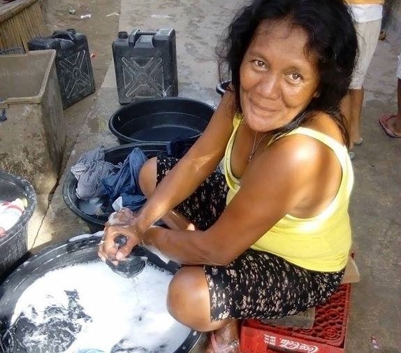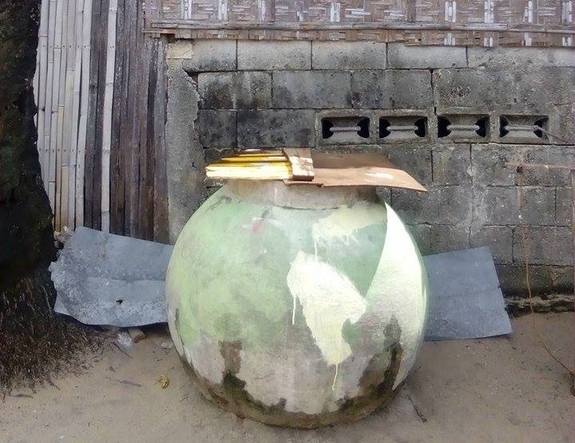 (水道システムが無いため、水ガメに雨水をためてお洗濯)