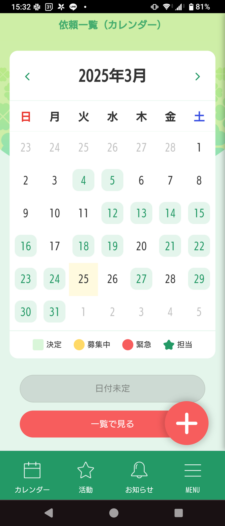 ①事務局側のカレンダー画面(+から依頼情報を入力。依頼が入れば、その日が黄色になる。)