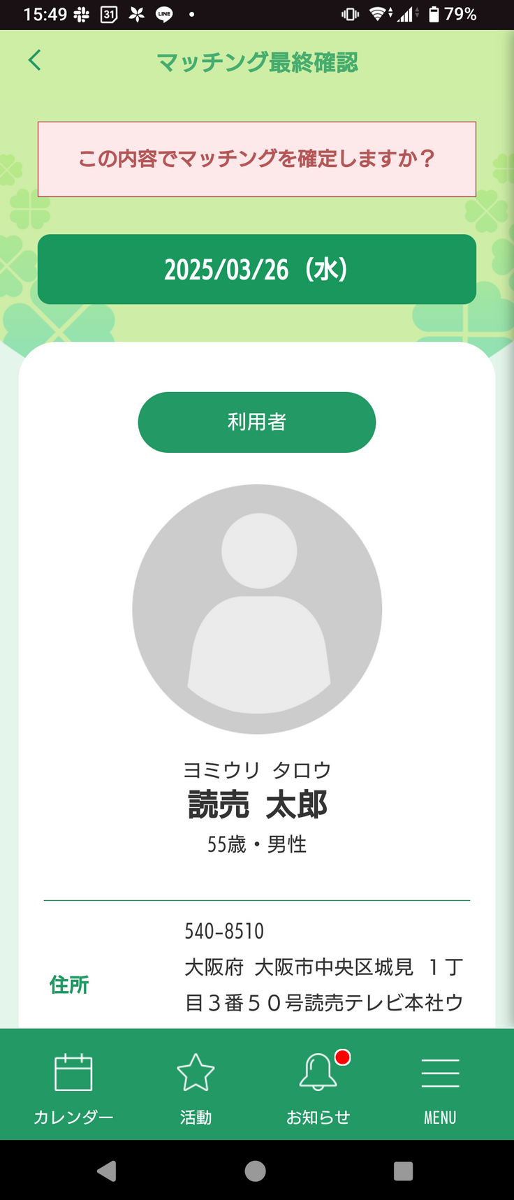 皆様のご支援を頂戴し、読売テレビのグループ会社である株式会社エイデックに正式にアプリの発注を行い、更に具体的な設計内容の打ち合わせを重ねてまいりました。そして、本年2025年3月にクローバーマッチングシステムが完成し、実際にスマートフォンに入れてのテスト送信を経て、この4月1日からクローバーの会員が、このマッチングアプリにアクセスして、多くの依頼の中から活動可能なものに対して、活動表明をアプリ上で行い、マッチングした時には、詳細がアプリ上で確認できることが可能になりました。依頼内容の追記、変更、活動後の、報告や交通費入力も、その画面上で行う事ができるようになり、コーディネーターの手間が大きく削減できるようになり、夢の様なアプリを手に入れる事が叶いました。時間の削減と、ボランティア側も、通勤途中の隙間時間などに、今、入っている依頼を確認することができ、とても便利になりました。