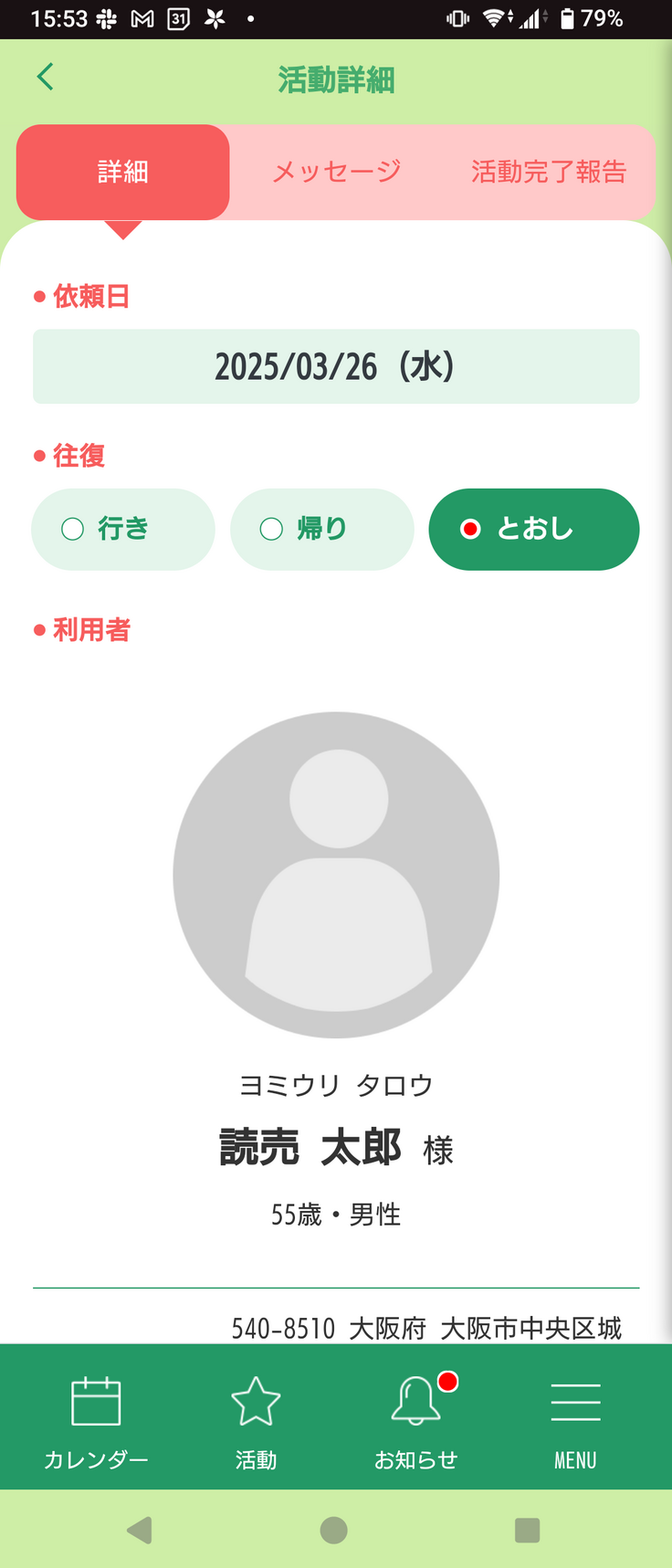 他にも交通費の入力画面や、その累計計算もできます。依頼の電話が入った時には、アプリの利用者検索で、登録が有るか否かが直ぐに分かり、依頼の受付も管理も楽になりました。