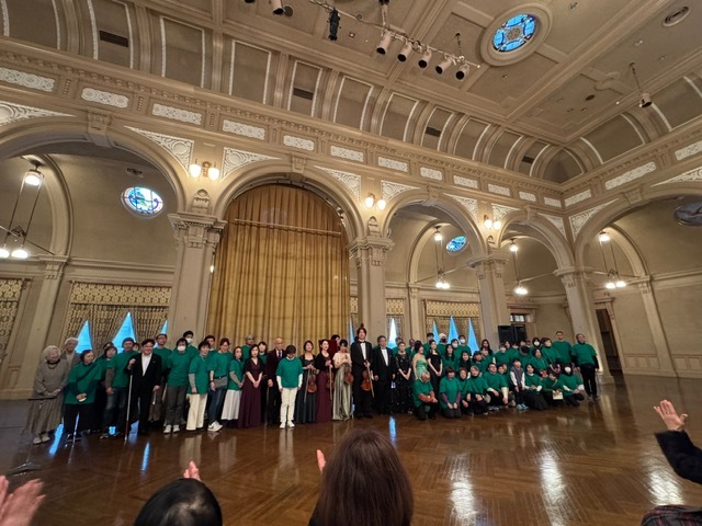 演奏会の一部は、利用者の司会進行のもと、利用者の歌やピアノ演奏、また、テレマン声楽アンサンプルとクローバーのメンバーも加わった合唱。二部は、テレマン室内オーケストラの演奏と続きました。終演時には、出演者とクローバー会員が前に出て記念撮影(写真の緑のTシャツはクローバー会員)