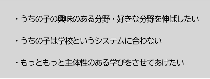親御さんからも「学校の枠にとらわれず、もっと自由な発想で学ばせたい」「自分の興味に基づいた学びを深めさせたい」という声を多く耳にするようになりました。