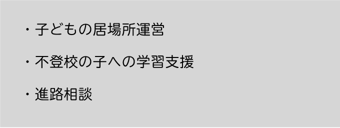 フリースクールこころは、未来を創るこどもたちへのキャリア支援のために、「ほんの少し背中を押してあげるだけで伸びる子どもたちがいる」という理念の基に、誰一人取り残されない学びを確保することを目的とし、こどもへの支援や機会を提供し、地域づくりを行っています。
