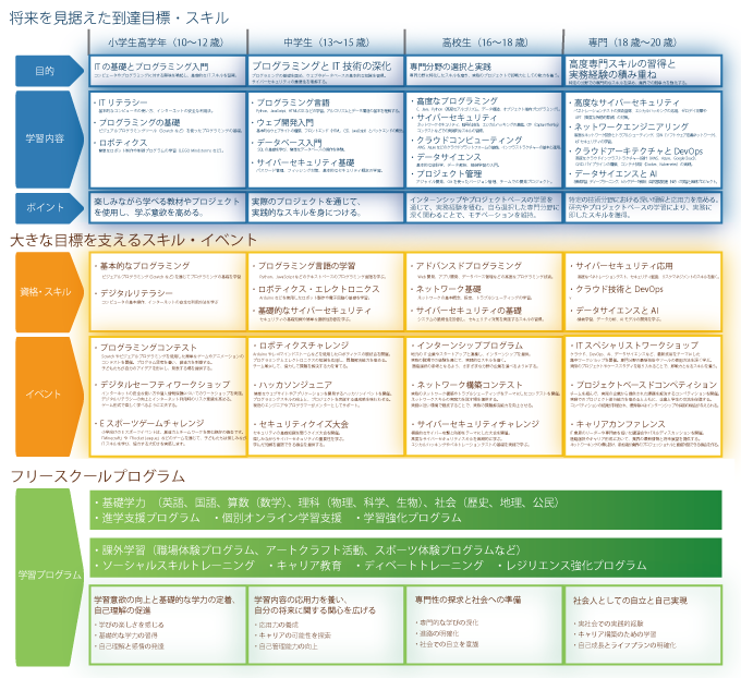 この新たなIT人材育成校では、小中学生のこどもたちも通えるような興味を持つ分野で自由に学べる環境を整え、「もっと自由に、もっと楽しく」をモットーにカリキュラムを設計します。それにより、長期的にITスキルや専門的な知識を身に付け、こどもたちが社会に繋がり、IT人材不足の次世代の担い手を育成できると考えます。