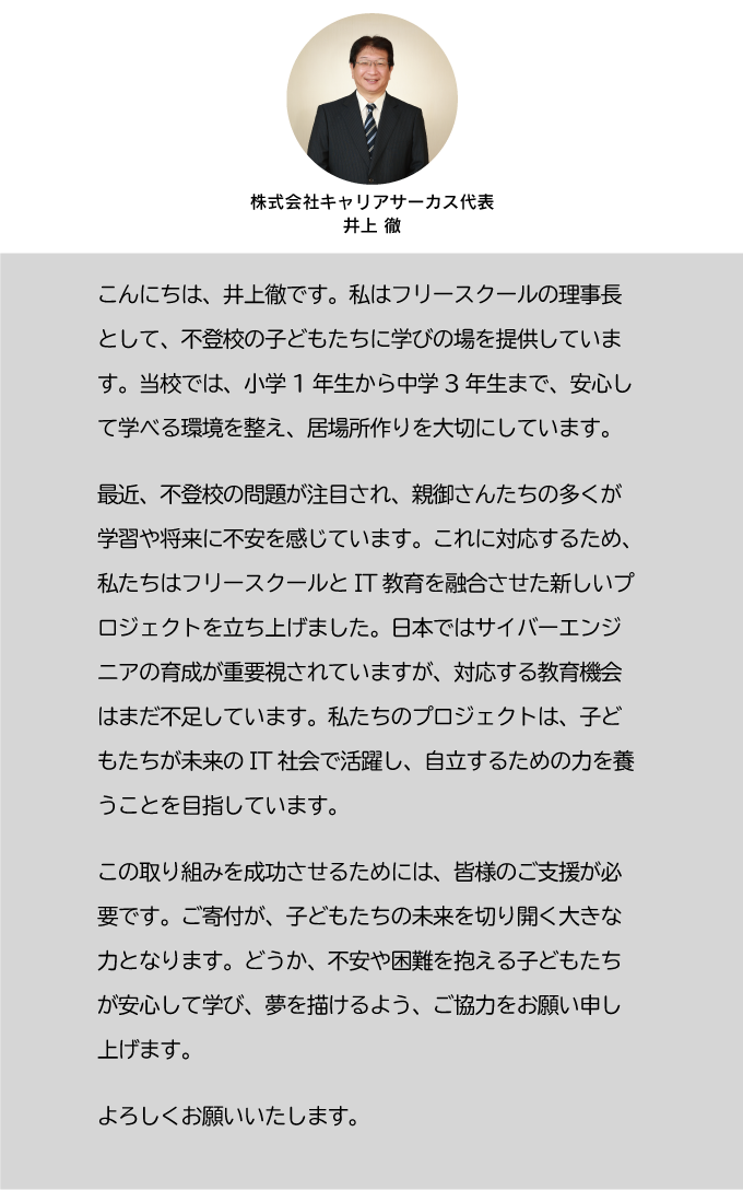 フリースクールこころが大阪に小中学生から通えるIT人材育成校を開校するため、集まった資金で、運営資金・機材購入・改修費用・開校準備に向けて大切に利用させて頂きます。