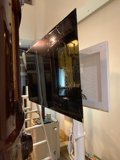 写真① モニター交換(右:新モニター(有機EL65インチ) 左:旧モニター)