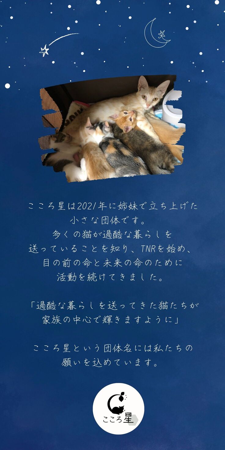 埼玉県東松山市を拠点とし、姉妹で活動する小さな保護猫団体です。 近所の弱っていた猫を保護したことがきっかけで様々な問題に直面し、野良猫の悲惨な現状、不適切な飼育によって苦しめられる動物達の存在を知りました。 問題の根深さを痛感し2022年に法人化。今では同じ思いの人たちとともに、様々な社会問題に取り組んでいます。人と動物が穏やかに共生できるまちづくりを目指しています。