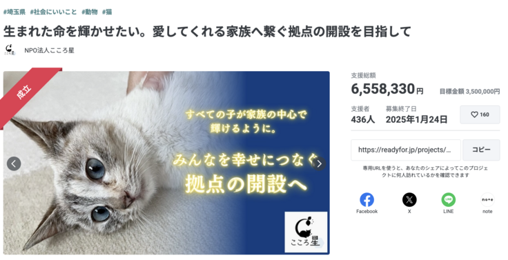 そこで、譲渡の課題を解決するため「譲渡特化型シェルター取得」に向けて2024年に初めてのクラウドファンディングに挑戦しました。結果として436人もの方々から多くのご支援をいただき、目標を達成することができました。本当にありがとうございました。