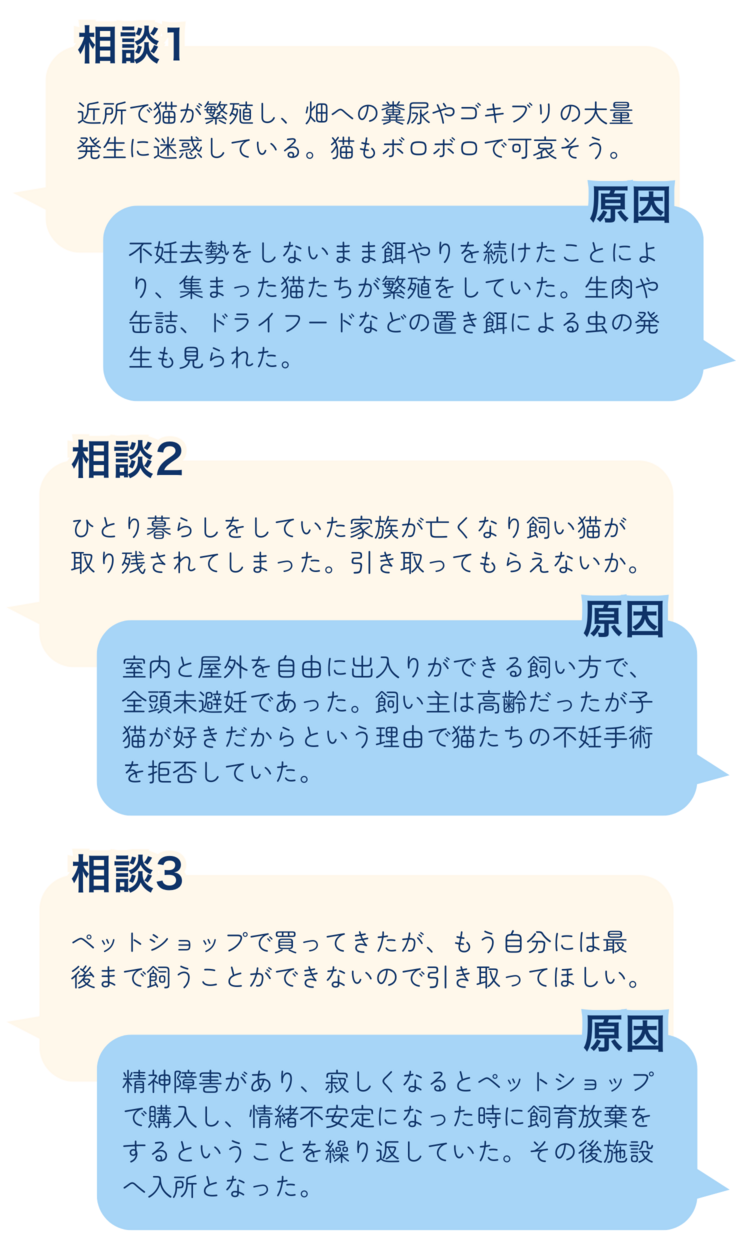 「畑に糞尿をされて困る」「野良猫が倉庫で出産したから引き取ってほしい」「一人暮らしをしていた家族が入院し、飼い猫の行き場がない」「猫を拾った。保護してくれないなら保健所に連れていく」