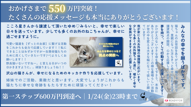 日々の応援や拡散のご協力、本当にありがとうございます。ここ数日、沢山の方からのご支援が届き、おかげさまで、第一ステップの600万円まで【あと48万円】となりました!