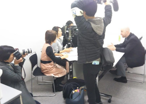 講演会前にテレビ局(長崎国際テレビ)、西日本新聞、読売新聞から取材を受けるロン氏