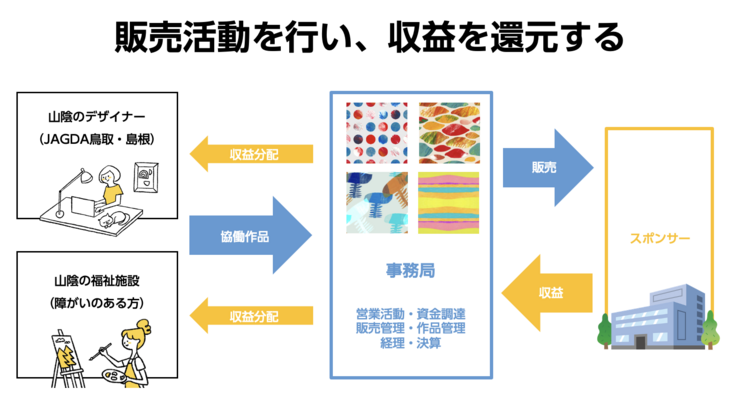 収益の一部は障がいのあるアーティストへ還元し、工賃アップと好きな作品づくりを仕事にすることができる