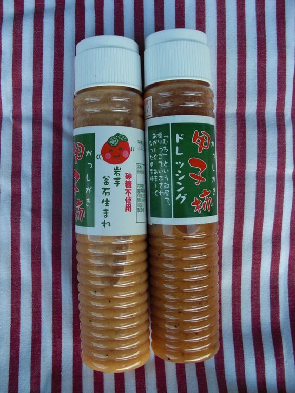 釜石市特産の甲子柿の創作農家こすもす特製ドレッシングです。甲子柿の特徴は、収穫後、煙でいぶして渋を抜く工程にあります。深紅に変わり、甘くとろりとしたえもいわれぬ触感になります。このドレッシングは、甲子柿の甘みやおいしさを活かすよう厳選した素材を使用しています。