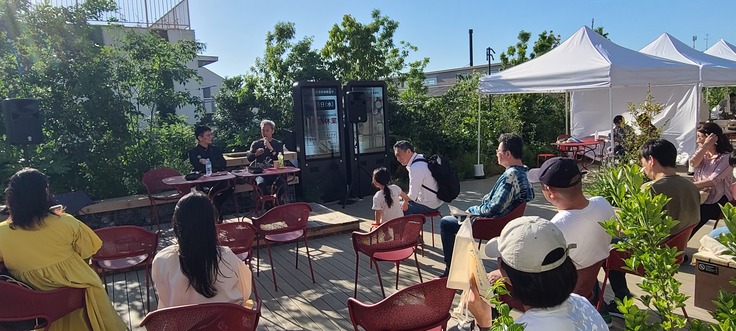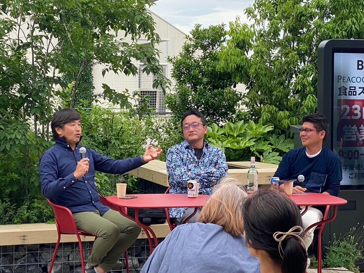 とは言え、専門用語が並ぶ難しい話に一般の来場者が耳を傾けてくれないだろうということで、対話形式のトークに、飲める方はアルコールもOKで、熱さをゆるさで多少カバーしながら通りすがりの人にも立ち止まって話を聞いてもらいたいというものでした。