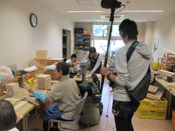 1日目は障害者の事業所で、クッキーづくりや、木工製品作り(エイブルクッキーBOXの打ち合わせ)など彼らが働く姿が撮影されました。