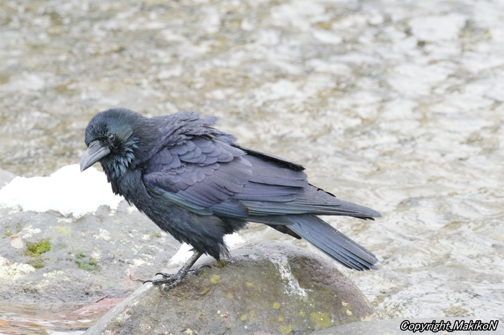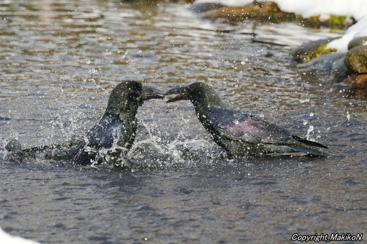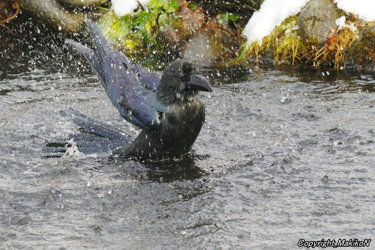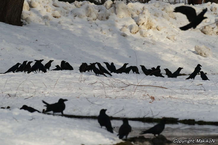 冬季は公園の噴水などがなくなり、水位の低い川はカラスの大浴場になります。