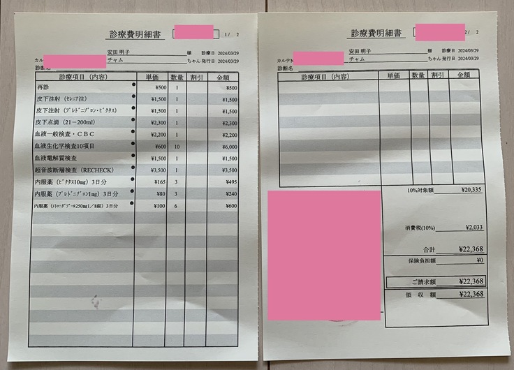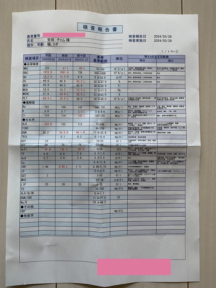 血液検査やエコーの結果、貧血と炎症の数値が高く、熱も40,4度あり、急激な食欲低下ということで、タイミング的にも再発の可能性がかなり高いそうです