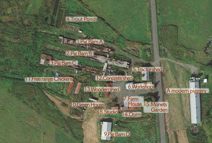 Example 2: A plot of the main body of the dairy farm of 5 ha in total: A large part of this land, which is nominally a 'field', is littered with abandoned, disused and rusting farm buildings. The place used to be profitable and well operated. Near the main house is a garden with a pond and a very beautiful red bridge, which reminds us of Monet's 'Nihonbashi' (Bridge of Japan). However, today this block is an eyesore and passers by avert their eyes. The rundown buildings are a nest for pests and the piggery stinks.
