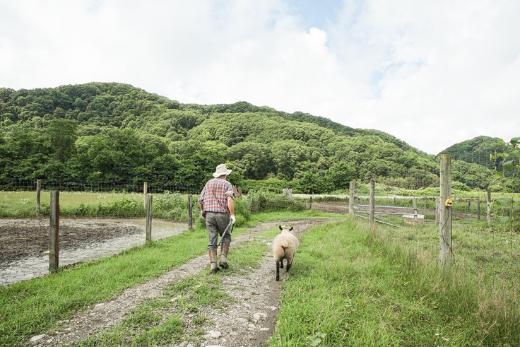 群れについていけない老羊Yasha が放牧地まで歩いていく道のりを一緒に歩くサイモン。