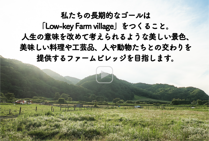 Our long-term goal is. To create a 'Low-key Farm village'. We aim to create a farm village that offers beautiful scenery, fine food and crafts, and companionship with people and animals that will make you rediscover the meaning of LIFE!