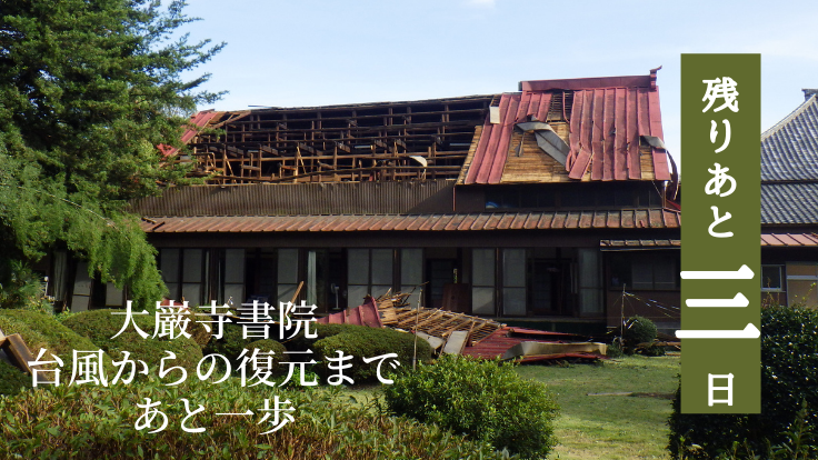たくさんの方々のお力をお借りして、工事は順調に進行しております。しかし書院は大きな木造建築のため葺く瓦は一万枚に及び、大屋根の修復だけでも1億円以上の費用を要する大工事です。その上、柱や梁等の朽廃の修復箇所が増え、今年夏の完成を目前にして費用があと一歩、不足している状況です。