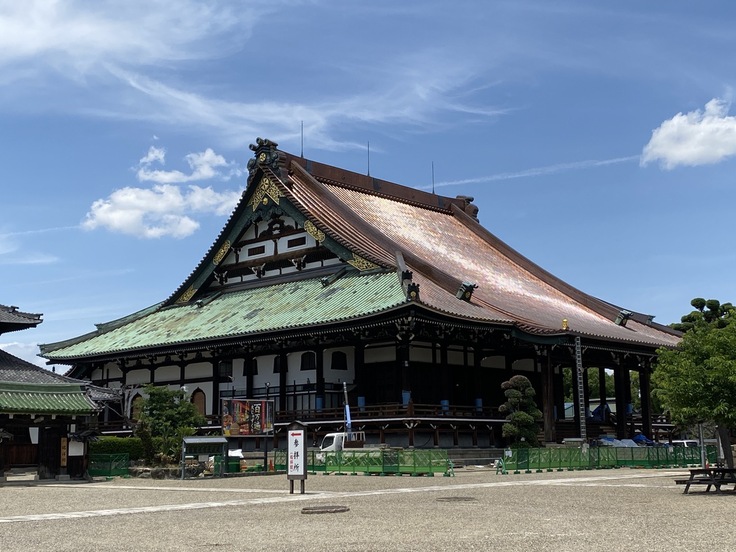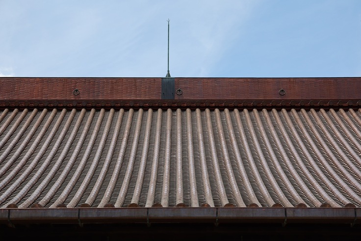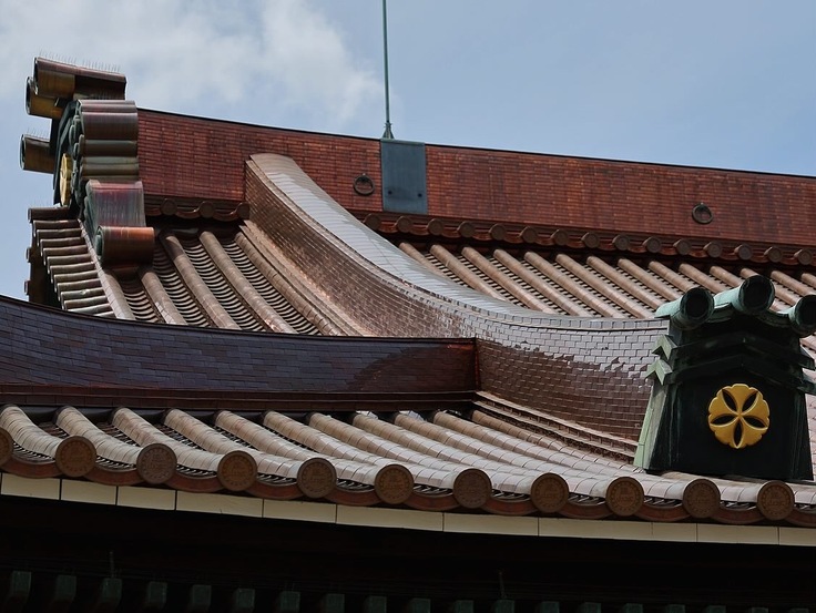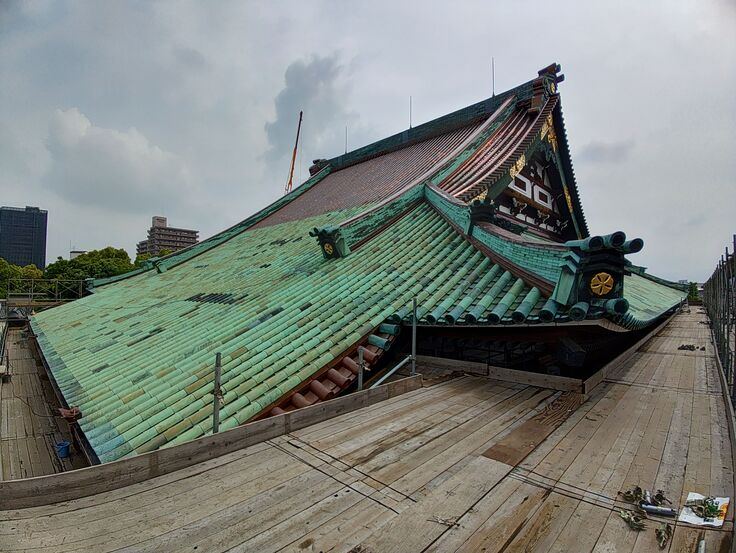 大念佛寺本堂の大屋根は本瓦葺きといって、平たい銅板の間に半丸状の銅板が据え付けられ、通常の瓦葺き同様の威風が感じられます。その大屋根に使用していた銅板は「緑青」という銅独特の青みがかった錆びが付着し、独特の風合いを楽しませてくれました。