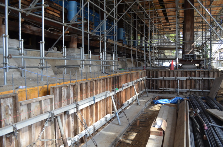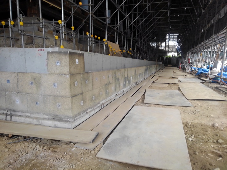 本堂が建つ基壇では周囲を囲む間知石を一度解体し、基壇をむき出しにさせた状態で液状化防止の土地改良工事が行われました。平野の地盤は軟弱でボーリング調査によると沈降の箇所が何か所も見受けられましたが、本堂が建つ基礎部分には昭和の初めに行われた人力による石つきによって強固に固められていたと報告がありました。