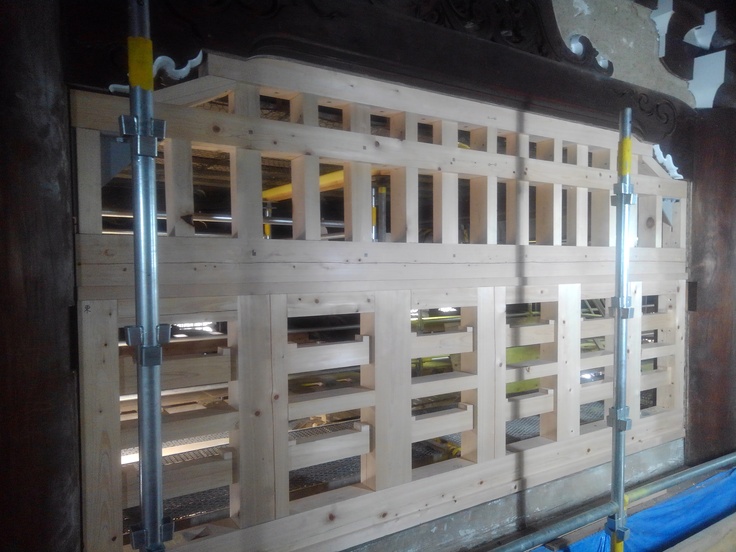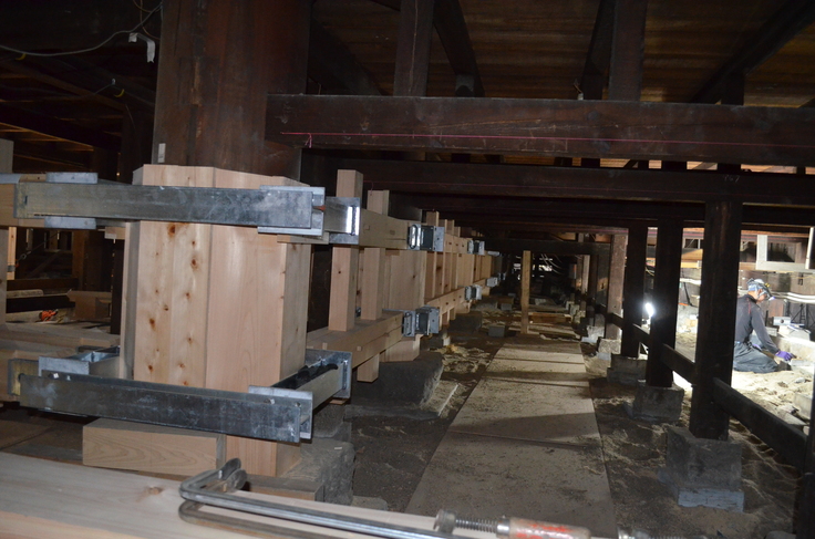 また、今後起こりうる南海トラフ巨大地震を見据えた構造調査において、耐震構造を施す必要があるとの見解から、「はしごフレーム」という木造柵による耐震工事が行われました。はしご状の木枠を床下や壁内部の柱と柱に取り付けられます。この木造フレームが巨大地震の揺れに効果を発揮してくれます。
