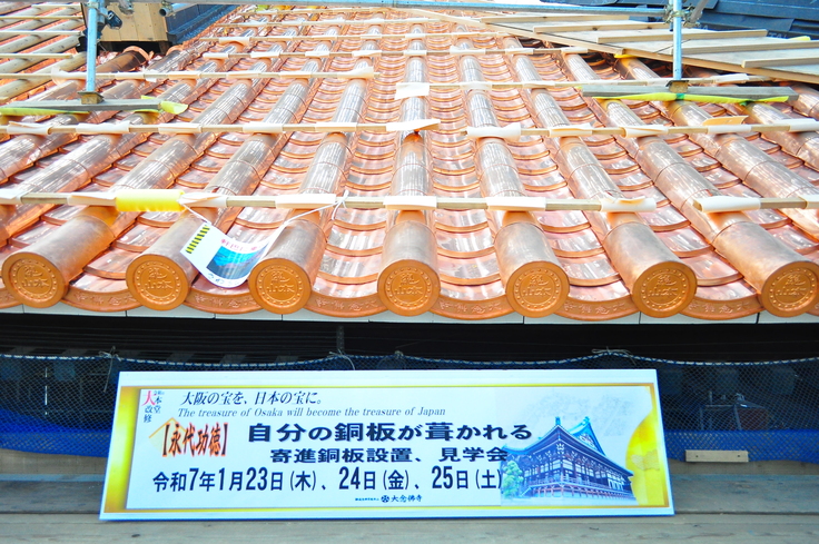 新調する銅板は丸瓦約5,320枚、平瓦約8,000枚を購入し、正面にあたる東向きと裏面の西向きに葺かれ、その中でも丸瓦を勧進瓦として皆様の芳名や祈願文を記入しております。