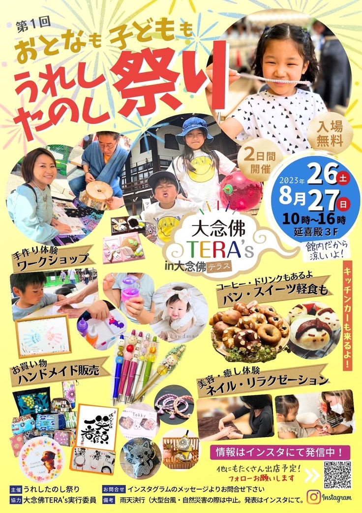 また、8月26日と27日は「うれしたのし祭り in 大念佛TERA’s(テラス)」を開催。涼しい建物内でハンドメイド雑貨の販売やワークショップなどの体験コーナーもたくさん用意しています。