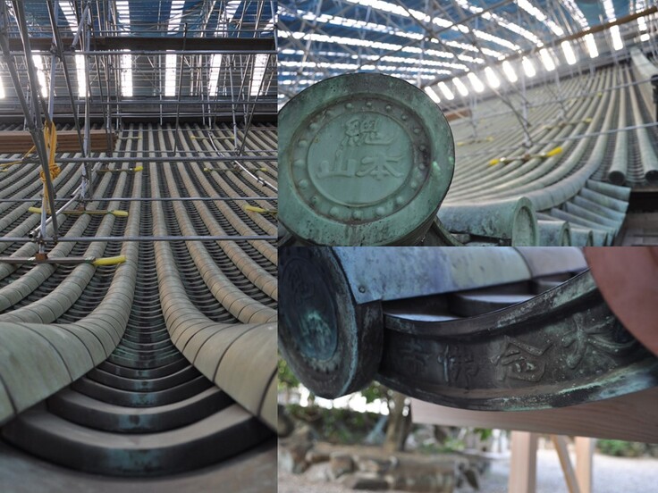 素屋根が完成し雨をしのげるようになった今月、これより銅板瓦の取り外し作業が始まります。