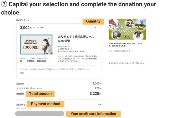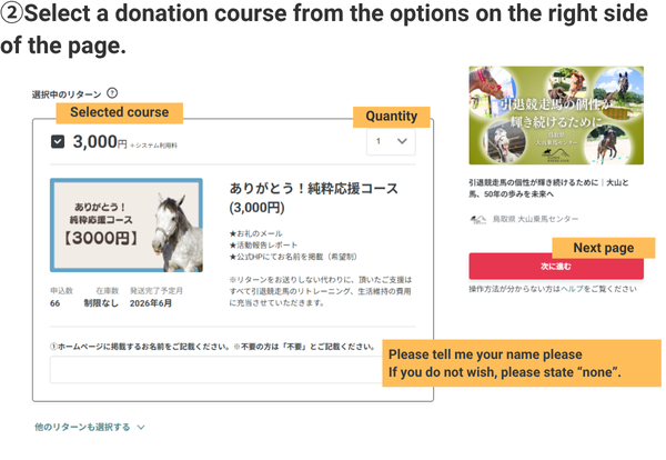 ※リターンをお送りしない代わりに、頂いたご支援はすべて引退競走馬のリトレーニング、生活維持の費用に充当させていただきます。