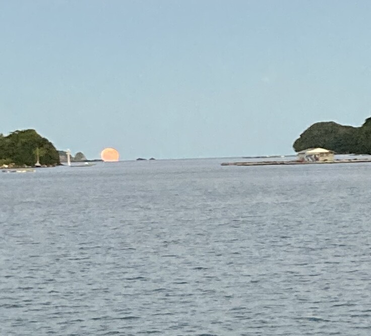 昨日は満月でした。やはり写真だと分かりづらいですが、海が登るお月様は、夕日を映して真っ赤で、燃え滾るマグマのような姿をしておりました。この日は、新しく行われるライトアップの点灯式でしたが、ライトが点灯する瞬間よりも、この満月を見たときの人々の歓声の方が大きく、しばらくの間みとれている人が多かったのが印象的でした。