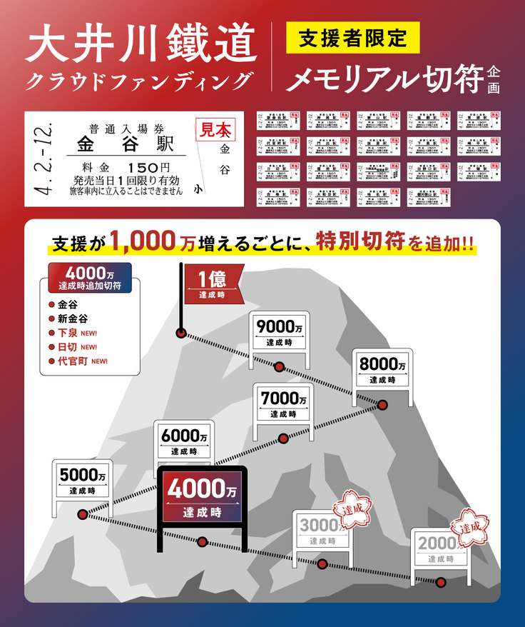 さて、ご支援金額が1,000万円を積み重ねるたびに、大井川本線の駅の硬券入場券を対象リターンをご支援いただいた皆様にプレゼントさせていただく企画。