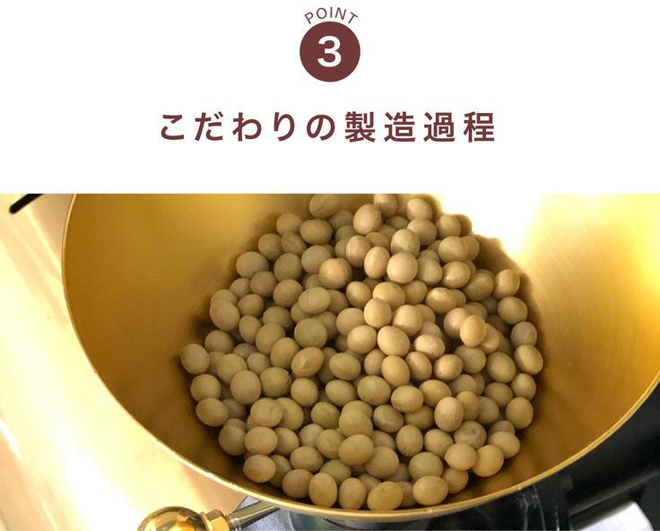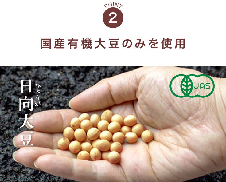 「国産有機大豆」のみを使用し、有機JAS認証を受けた国産大豆「ヒュウガ大豆」を国内で焙煎しております。