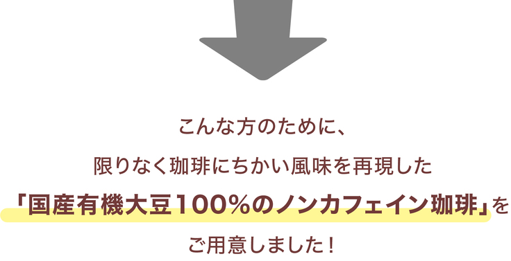 そんな私たちですが、妊娠や薬の飲み合わせ、お腹の調子などの関係でカフェインが摂れない方でも美味しくお飲みいただける「千葉県産の有機大豆を100%使用したノンカフェイン大豆珈琲」を開発しました。