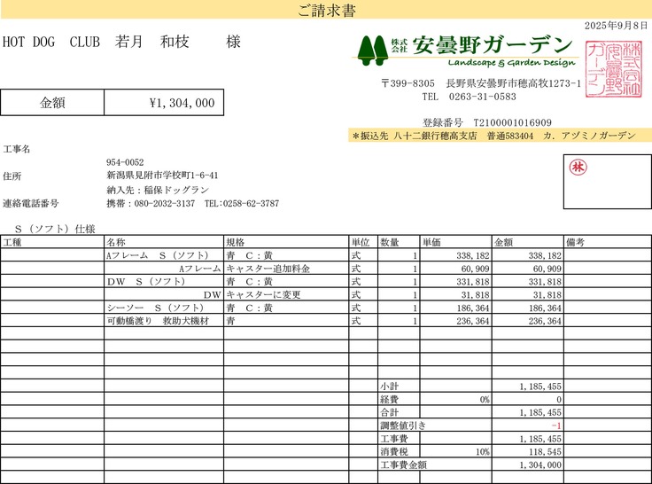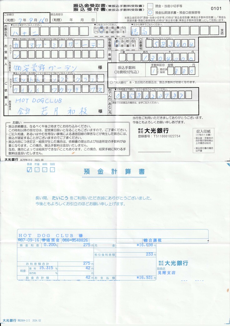 通帳残金¥16,931は HOT DOG CLUBに入金し、夜になると真っ暗になるディスクエリアの投光器の代金に補填させて頂きます。