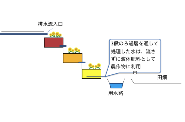 トイレの製作は、日本大学工学部の技術協力と、町の協力を得て行います。まず、配管を埋設し、排水が砂や細かいガラスなどを敷き詰めた3段階のろ過層に流れ込むようにします。排水をろ過層に浸透させ、砂やガラスを通すことで物理的にろ過させるだけでなく、ろ過層内にある生物膜や、住みついた微生物による生物学的な分解によって、排水をきれいにします。