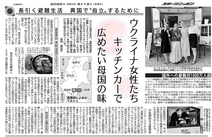 高森町のウクライナ避難民の皆さんのキッチンカーでの活動の様子が、22年8月12日(金)付のスポーツニッポンで紹介されました。
