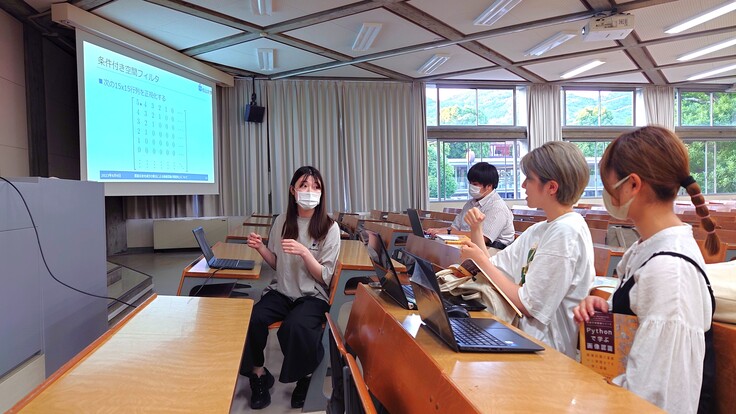 通常のゼミとは別枠で,画像認識の研究に興味のある学生を集めて4月から放課後に勉強会を開催しています。参加している学生たちは1年次生から4年次生まで。書籍「Pythonで学ぶ画像認識」をテキストに,画像処理に関するプログラミングを通じて,実用的なアルゴリズムについて議論しながら考えています。