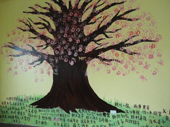 今回再建された教室の壁に、子供たちと参加者の方々のハンドプリントで出来た、桜の木が描かれています。