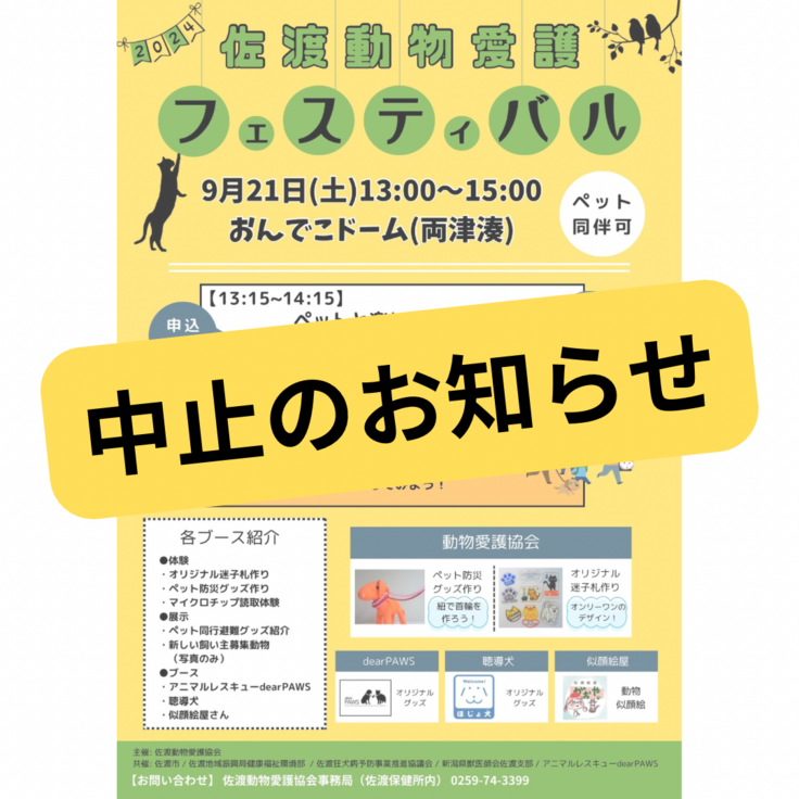 明日開催予定だった佐渡動物愛護フェスティバルですが、気象庁のHPでも警報級の可能性が高いとされておりますので、安全面を考慮して本当に残念ではありますが、中止の決断となりました😭💦💦💦